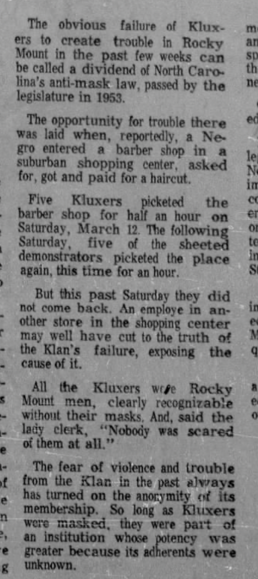 As this report on a failed 1966 campaign in Rocky Mount, North Carolina, makes clear, the Klan was only "the Klan" when identities of individual men disappeared behind their uniform sheets and uniform masks; when their faces were visible, they were once again individuals, known to locals and not to be feared.