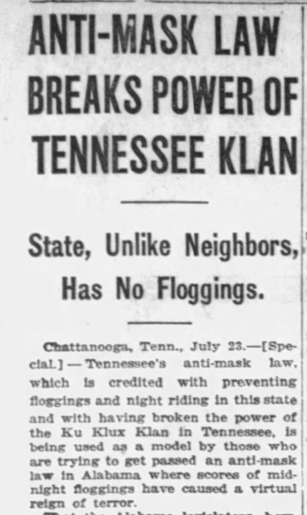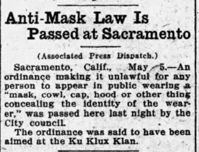 Between the 1920s and 1950s, more than a dozen states passed laws banning masks in public, as a concentrated effort to weaken the Ku Klux Klan simply by robbing the cowards of their anonymity and exposing their identities in public.