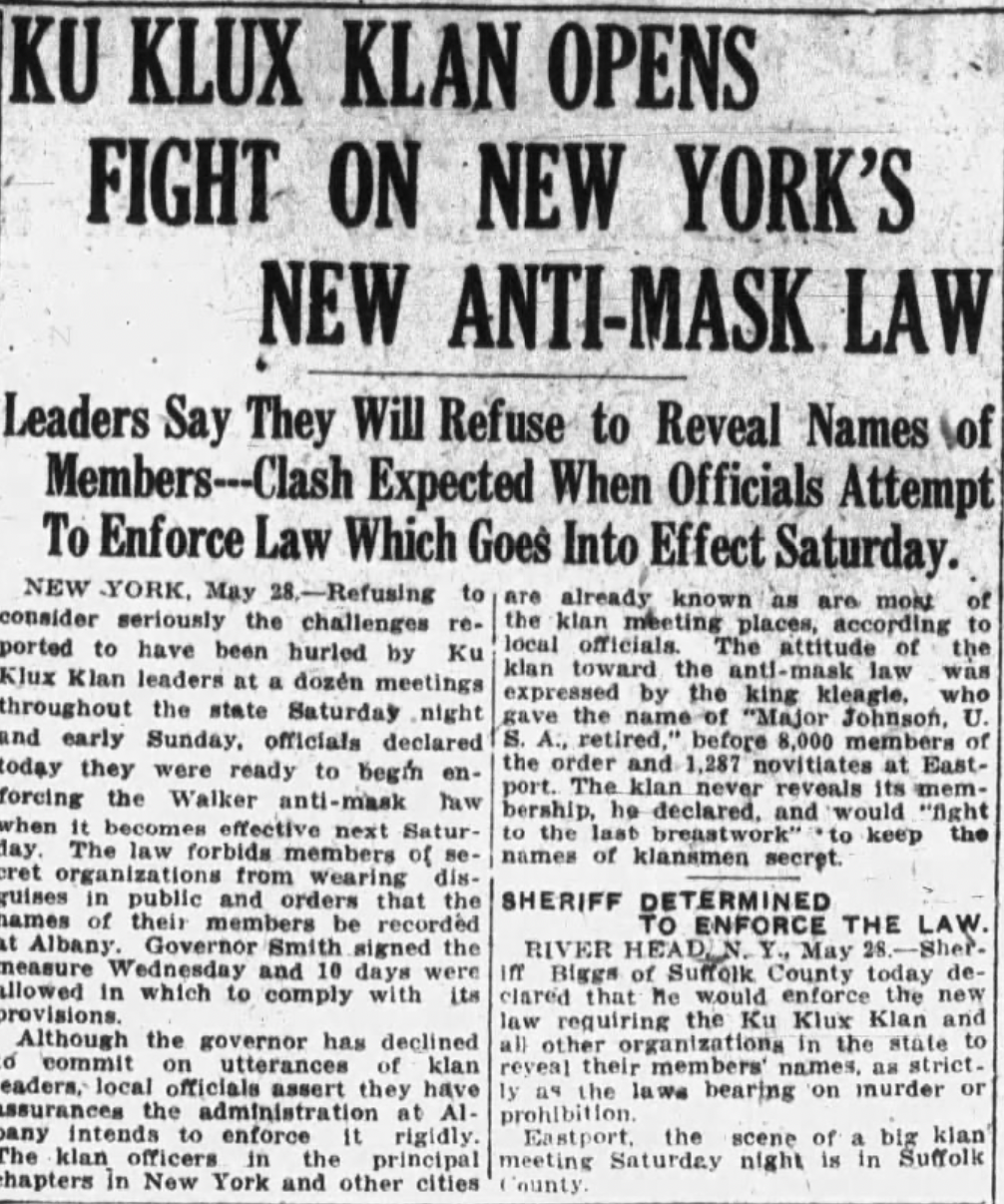 Likewise, here's a piece on New York's anti-mask law, which was passed in 1923: