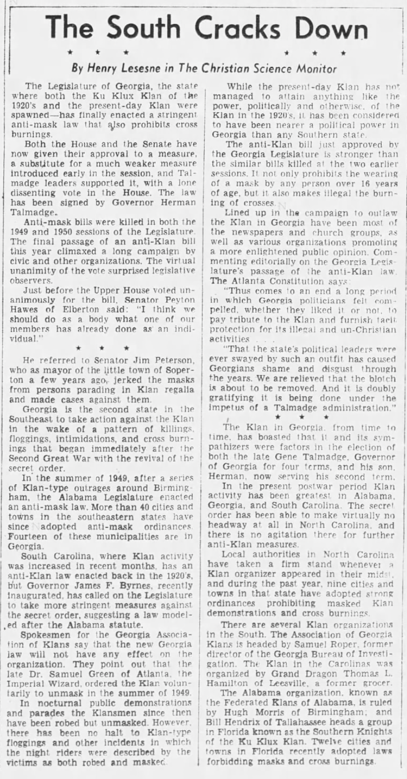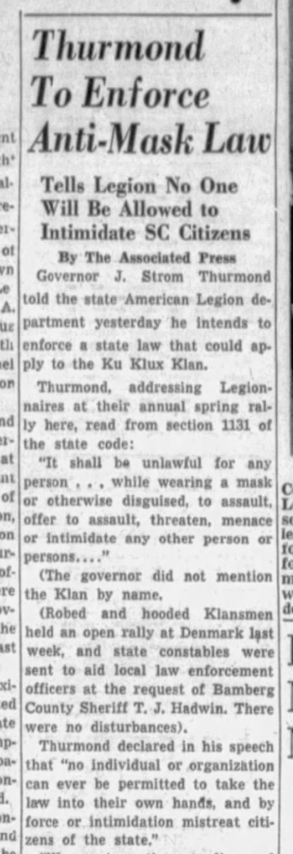 Here, for instance, is a piece on South Carolina Governor Strom Thurmond announcing that he would use the state's anti-masking law, passed in the 1920s, to combat the white supremacist order. (Yes, that Strom Thurmond.)