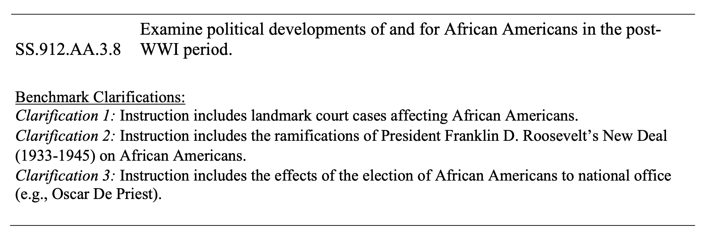 Some of the standards are actually quite good! The parts on cultural and social movements in the early 20th century seems solid, for instance, and the general approach to civil rights leaders works fine.